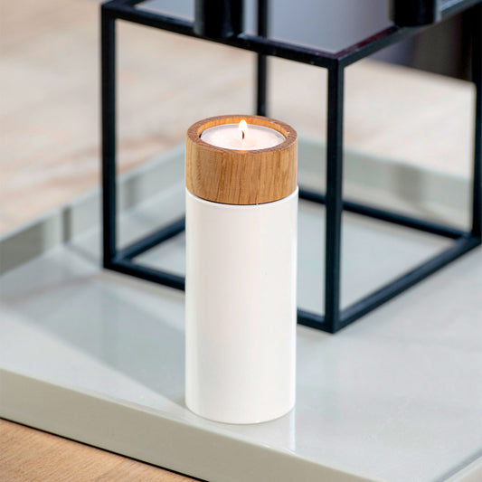 Teelichthalter 'Akku' | cremeweiß | Eiche geölt und Aluminium pulverbeschichtet | DM 4,9 x H 13 cm | für 5 Ersatzteelichter| Made in Germany