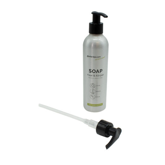 Naturliche Seife für Körper, Haar & Hände | Refill-Reinigungspflege | für Groß und Klein | Basis-Alu-Spender | 250 ml | für Bad und Beauty Bag | Hergestellt in Österreich