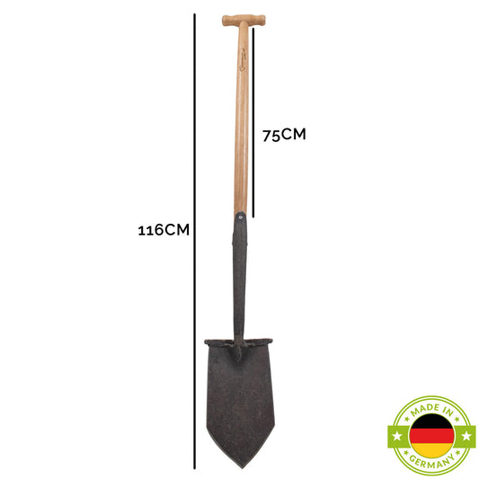 Spitzspaten mit Tritt | aus Schwedenstahl | mit stabilem Eschen-T-Stiel 75 cm | handgeschmiedet in Deutschland