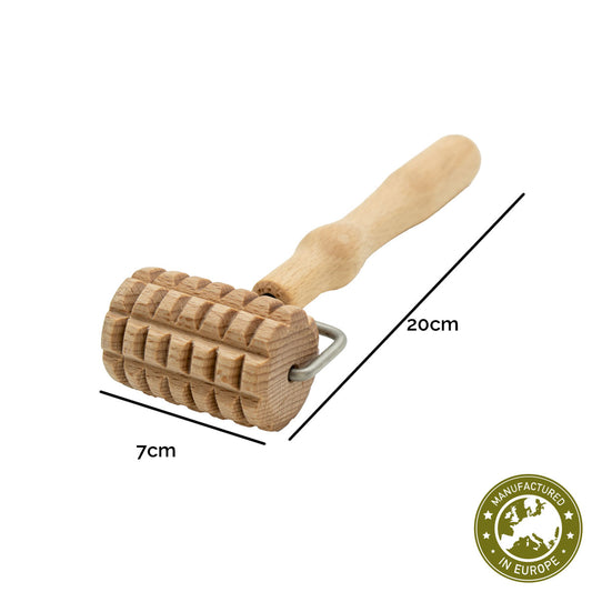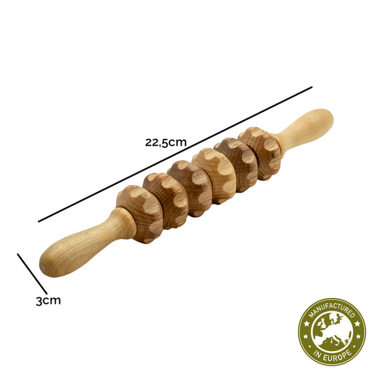 Rücken Massageroller | Buche massiv | 2 Griffstangen | 25 Rollen mit Kerben | Faszienrolle Massagegerät | Manufactured in Europe