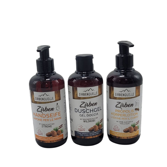Rundum-Pflege- Set 'Alpenglück & Zirbenzauber' | Duschgel + Handseife + Propolis Körperlotion | je 250 ml