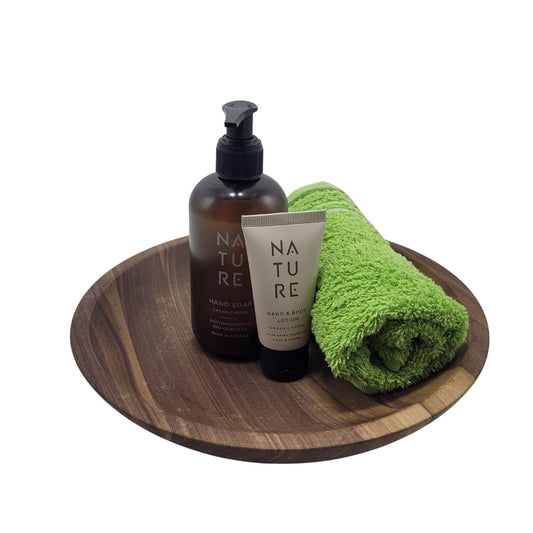 Home-Spa-Geschenk-Set 'Organic Herbs' | Handseife | Hand & Body Lotion | Schale Nussholz | Gästehandtuch | Made in Austria and Europe