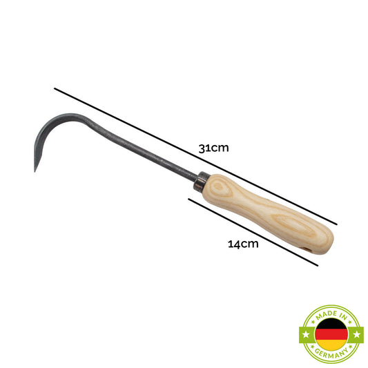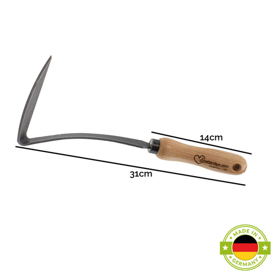 Japanische Sichelhacke Linkshänder | aus Schwedenstahl | mit 14 cm ergonomischen Eschengriff | inkl. gratis Schleifstein | handgeschmiedet in Deutschland