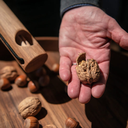 Nusskracher aus Massiver Eiche mit Schwarzem Gummi zum Aufziehen und Loslassen