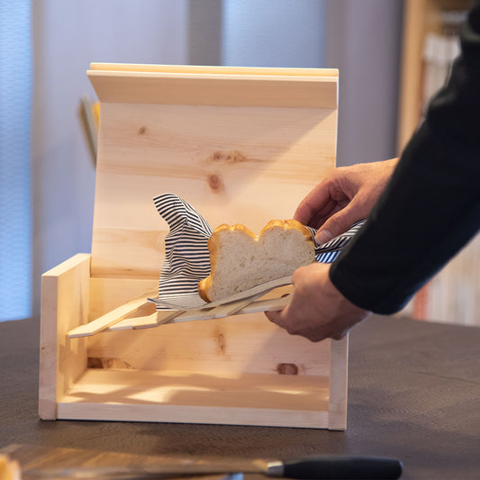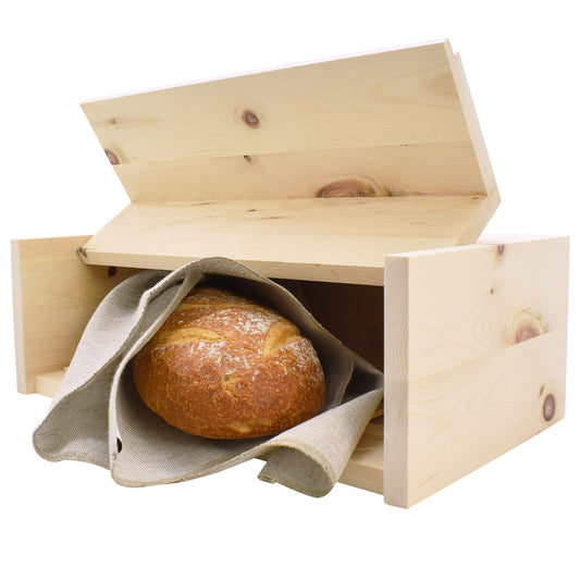Brotkasten mit Klappe | inkl. Zirbenholz-Gitter & Bäckerleinen | 45 x 16 x 25 cm | 100% Zirbenholz | Echtes Handwerk