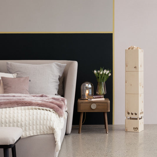 Raumlüfter 'Luft' | 2 x Essenz-ÖL 30 ml | Zirbenlocken 250 g | L 16 x B 16 x H 40 cm | bis 30 m² | Zirbenholz | Netzstecke inkl. Kabel | Made in Austria