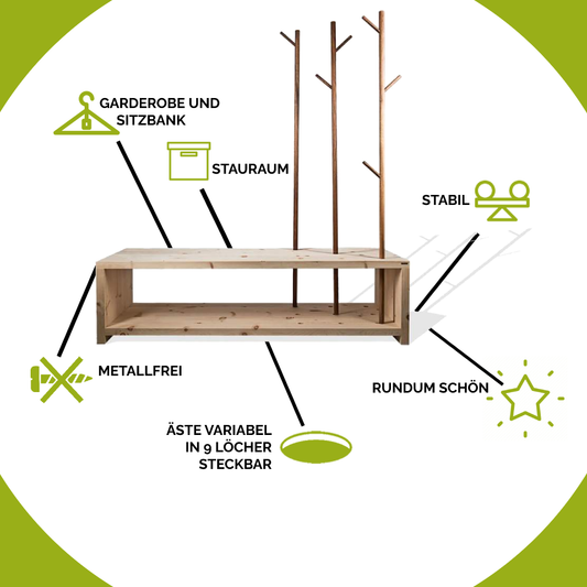 Massivholz Garderobe/Sitzbank 'MyStyle' | 3 Kleiderstangen aus Nussholz | B 150 x T 50 x H 45 cm | verschiedenen Stärken und Holzarten | echte Handarbeit aus Österreich