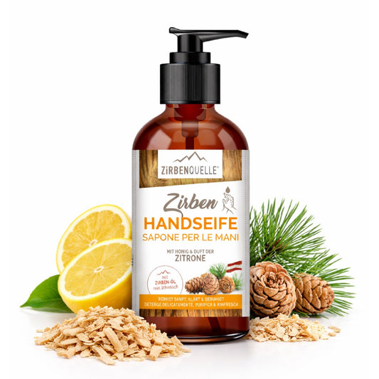 Zirben Handseife | 250 ml | Pumpflasche | mit Honig und Duft der Zitrone | Made in Austria