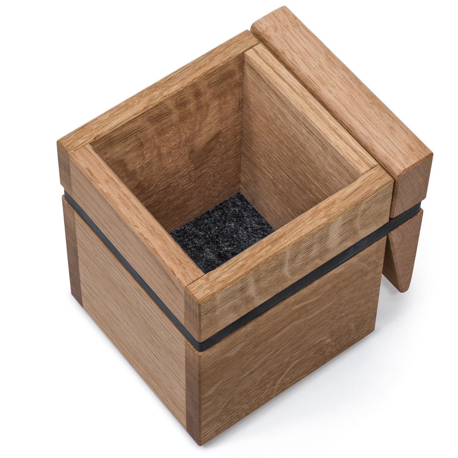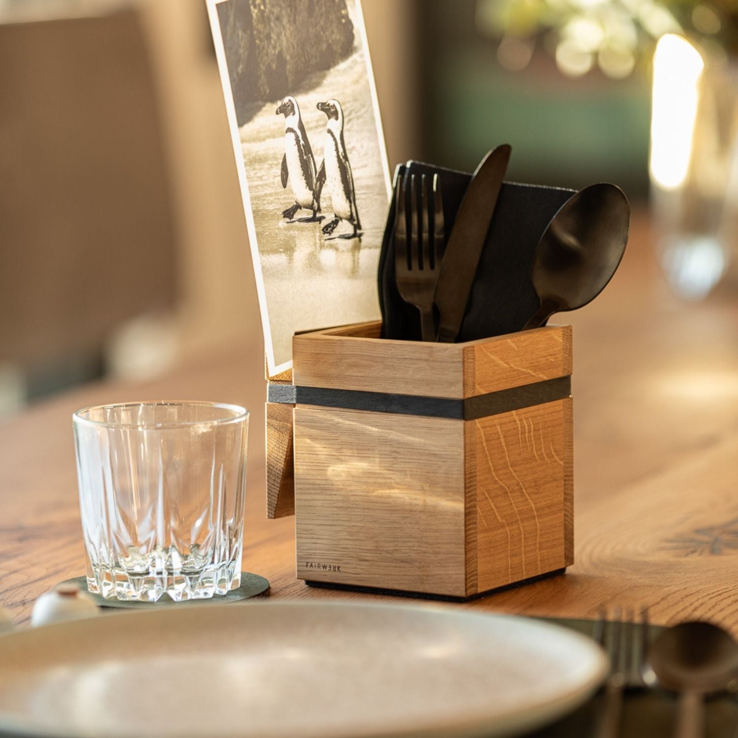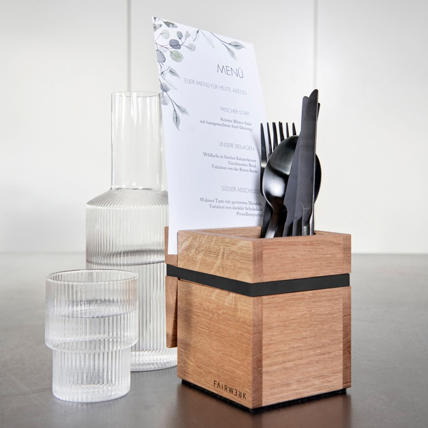Ordnung auf dem Tisch. In diesem Besteckhalter findet das Besteck einen besonderen Platz und in der integrierten Notizklammer, die mit einem farbigen Silikonband gehalten wird, präsentiert sich das Tagesmenü, die Speise- oder Brotzeitkarte. Eine Filzeinlage aus Violan lässt ihr Besteck lautlos einstecken. Auch der Boden ist mit einer dicken Violan-Filzschicht versehen und damit Teil des Designs. Zeitgleich schützt der Filzboden ihren Tisch vor unschönen Kratzern und lässt die Besteckbox lautlos abstellen und verschieben.