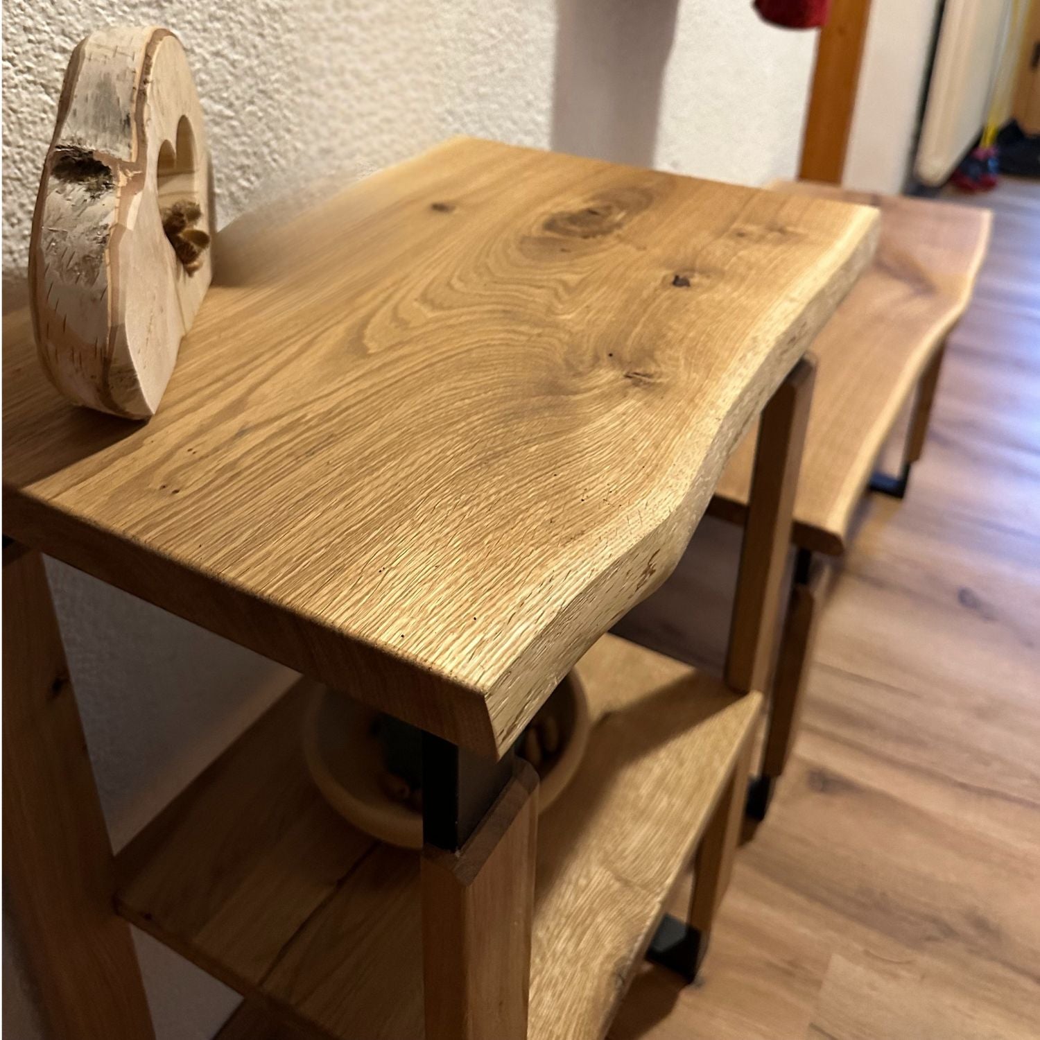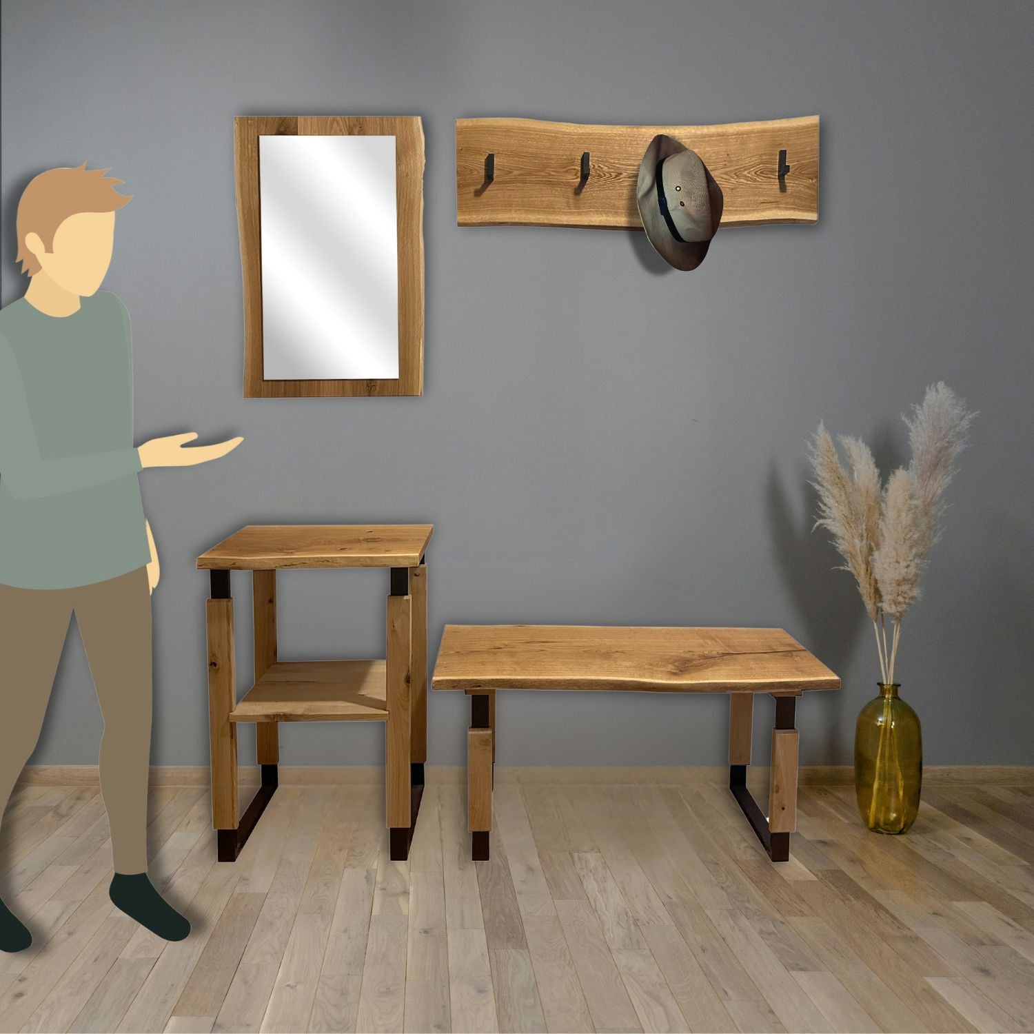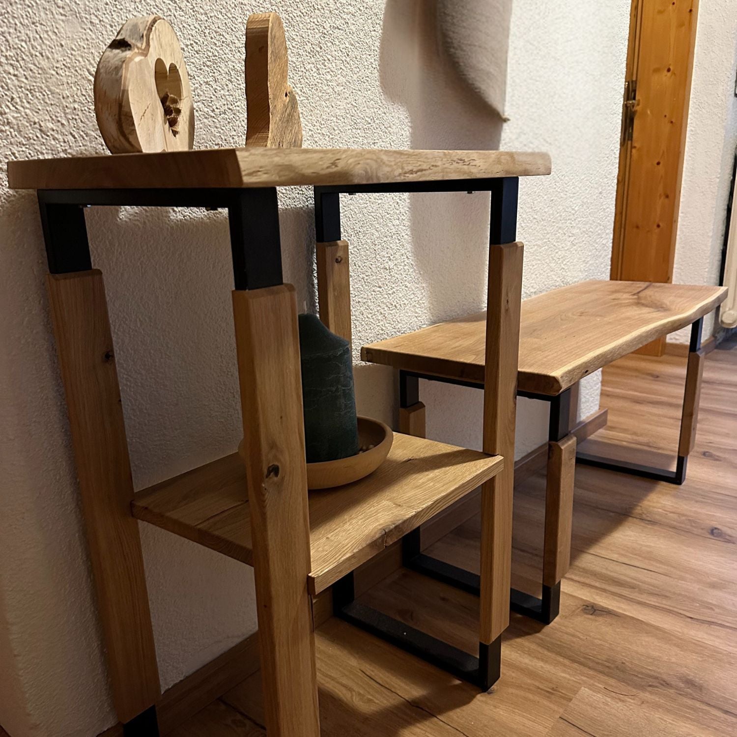Durch die Verwendung von Eichen Massivholz mit Baumkanten und einem schwarzen Metallgestell erhalten die Möbelstücke einen rustikal-modernen Charme, der perfekt in jedes Zuhause passt.