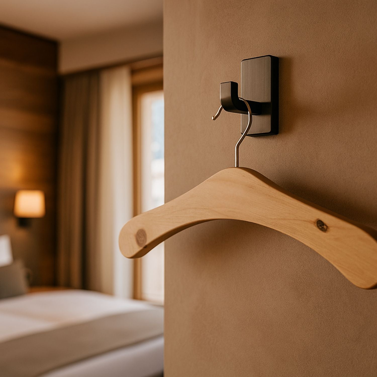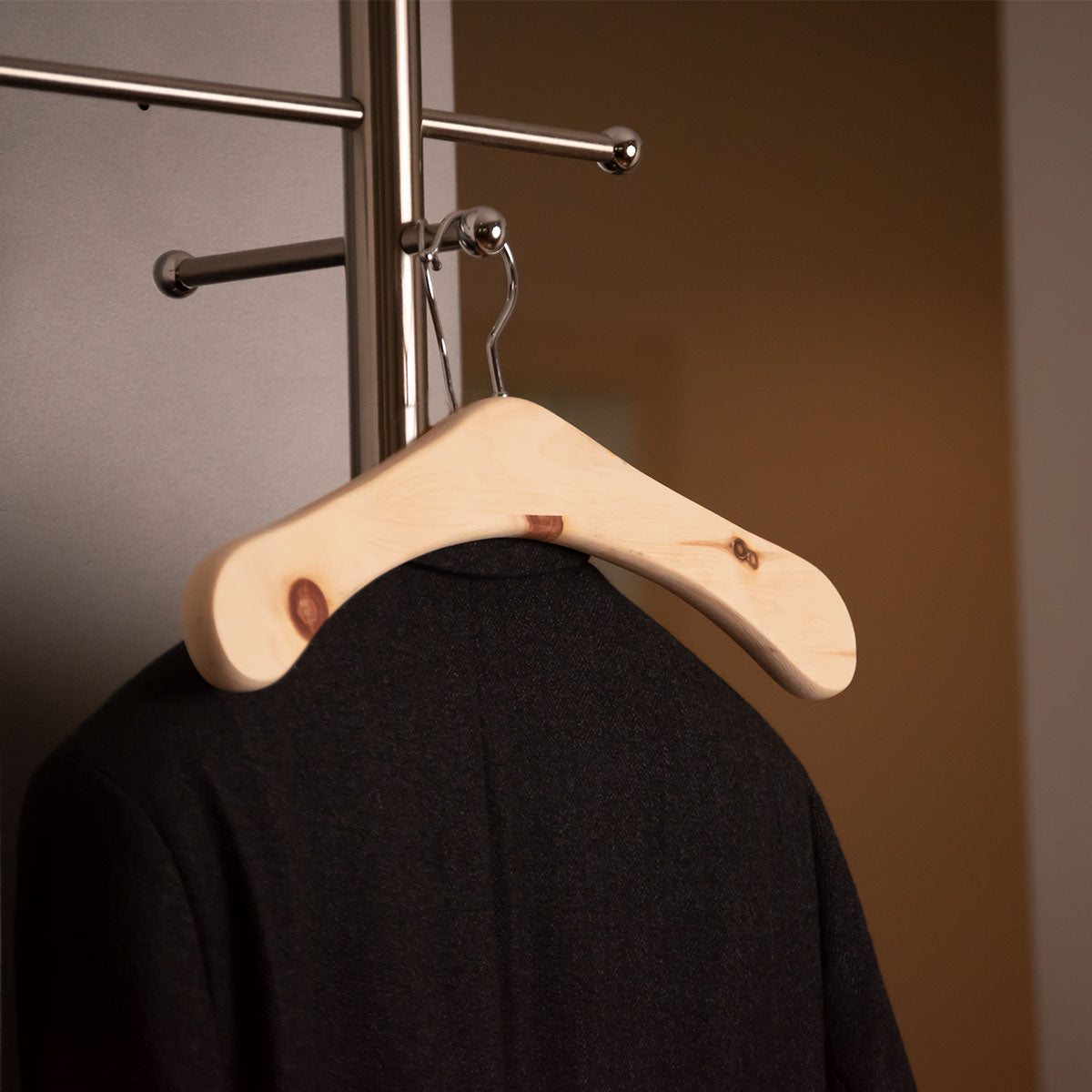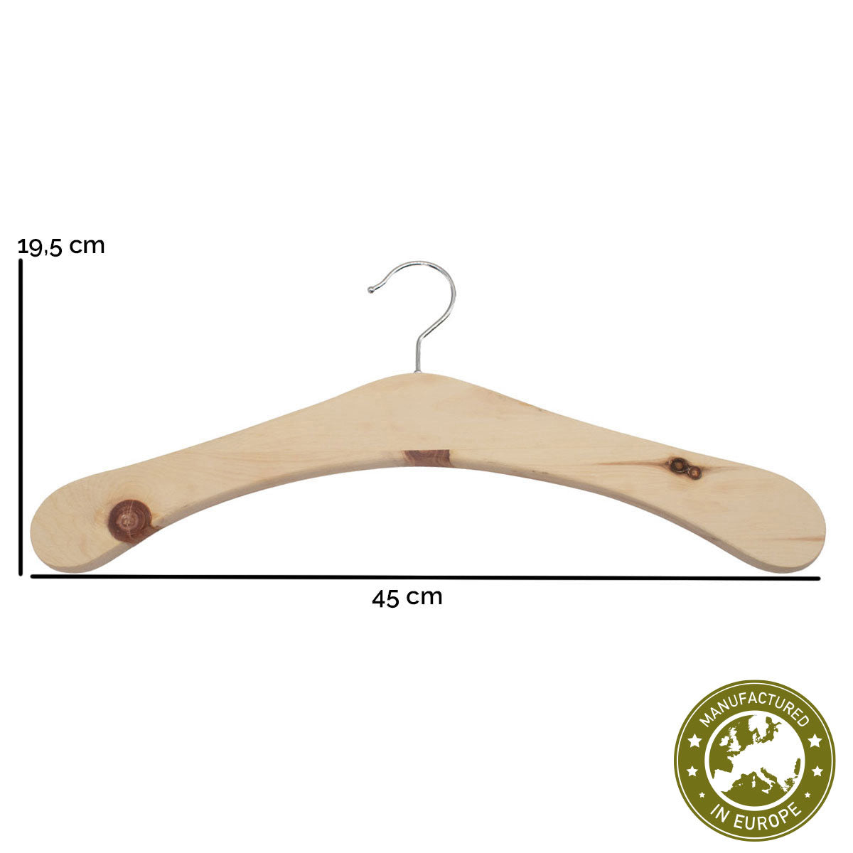 - Hochwertiger und stabiler Kleiderbügel aus massivem mottenabwehrendem Zirbenholz.