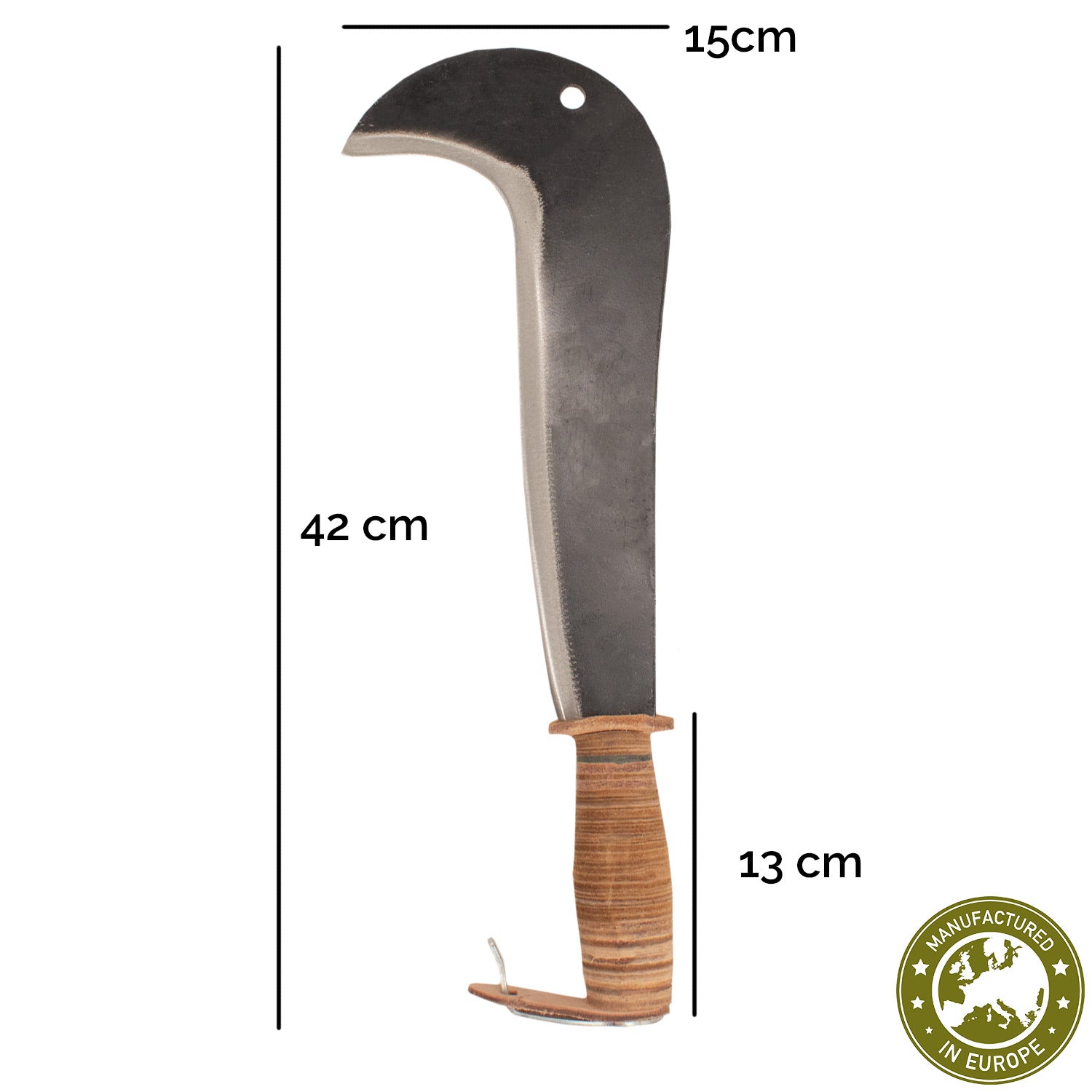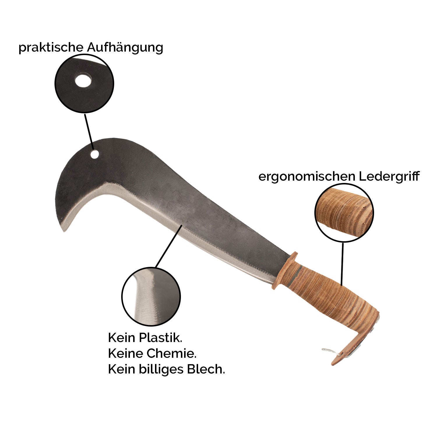 Für müheloses und umweltschonendes Arbeiten in der Land- und Forstwirtschaft oder im Wein- und Gartenbau ist das Schweizer Gertl ‘Hangup’ ein ideales Werkzeug. Zum Schälen des Holzes, Auslichten des Unterholzes und Durchtrennen von dünnen Baumstämmen, aber auch für die Entfernung jeglicher Pflanzen wie Wildwuchs, Wildsträucher oder kleinere Gewächse - dem Einsatzgebiet sind keine Grenzen gesetzt. Der Griff aus Leder incl. Abrutschschutz gewährleistet sicheres Arbeiten.