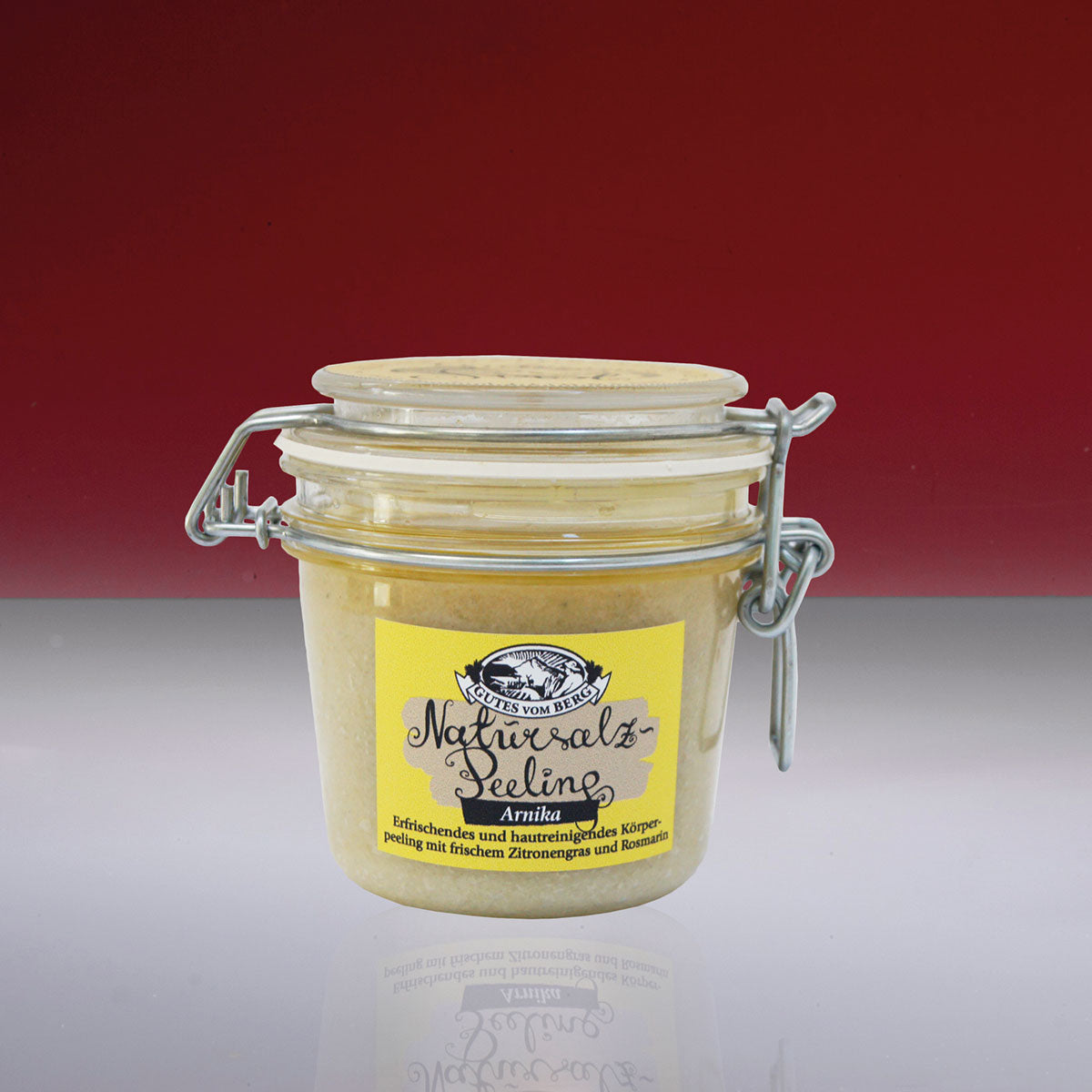 Junge Haut erneuert sich stetig. Und zwar in einem 24-Tage-Rhythmus. Bei älterer Haut nimmt dieses Intervall zu. Das ist auch der Grund, weshalb die Haut verbraucht und müde aussieht. Mit Hilfe des Arnika-Natursalz-Peeling wird dieser Erneuerungs-Prozess beschleunigt. Die oberen Hautschichten werden sanft abgetragen, der Reiz zur Zellneubildung wird stimuliert. Bei einer regelmäßigen Anwendung ergibt sich ein deutlicher Verjüngungseffekt für die Haut. Damit können durchaus kleine Fältchen und verschiedene Pigmentstörungen, große Poren und Akne behandelt werden.Das auf natürlichen Wirkstoffen basierende Arnika-Natursalz-Peeling ist ein feuchtigkeitsspendendes und erfrischendes Natursalzpeeling und besteht aus den natürlichen Peeling-Körpern Bergsalz und mikronisiertem Zeolith. Zeolith ist ein in der Natur vorkommender Mineralstein mit nachgewiesen entgiftenden Wirkungen. Die mit verarbeitenden Wirkstoffe der Arnika-Blüte und des Zitronengrases runden die positiven Effekte auf die Haut ab. Unser Arnika-Natursalz-Peeling wirkt kühlend, regenerierend und vitalisierend nach sportlicher Beanspruchung.