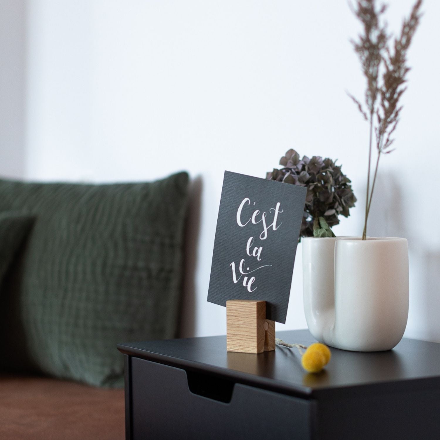 Lose Notizzettel, Karten oder Bilder – mit der Notizklammer aus Eiche werden sie aufgeräumt und gleichzeitig ansprechend präsentiert. Die magnetische Klammer hat alles im Griff.