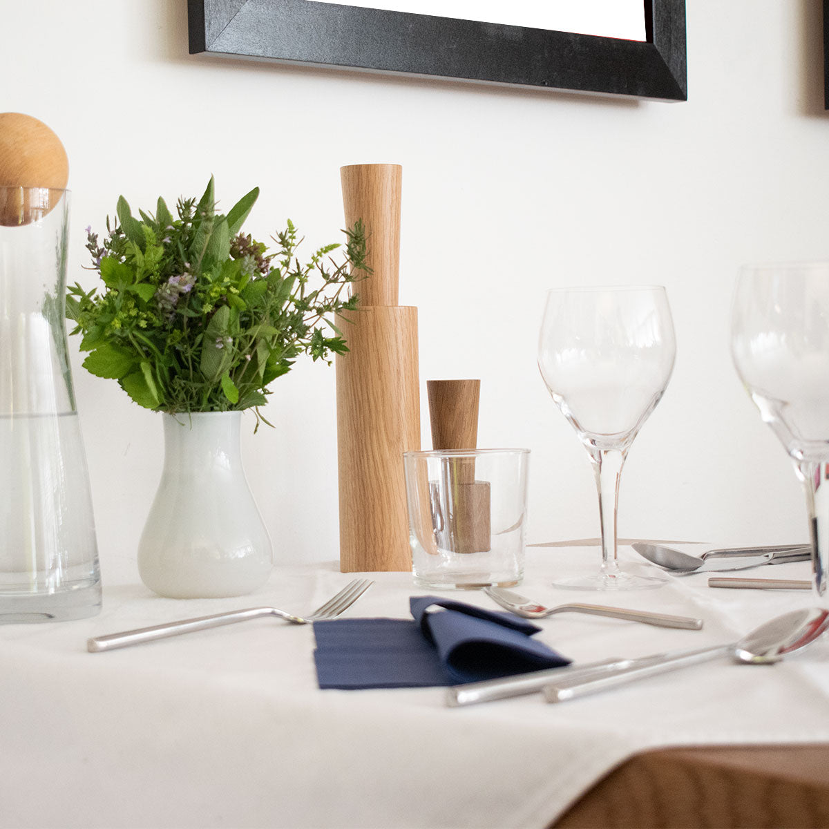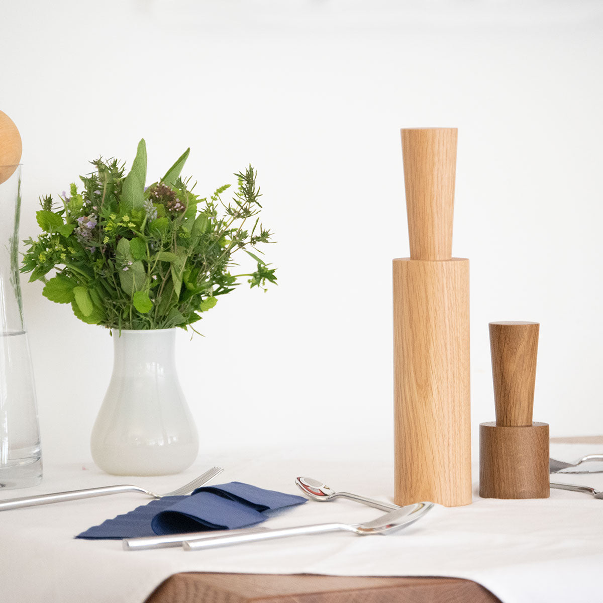 Klar in ihrer Form und zuverlässig und präzise in ihrem Tun. So könnte man kurz und bündig die Salz- bzw. Pfeffermühlen aus dieser Serie beschreiben. Sie schmücken jeden Tisch und stechen durch ihr auffälliges Design ins Auge. Die Funktion wird dabei aber natürlich in keiner Weise vernachlässigt. Das zeigt sich unter anderem durch die Integration eines Keramikmahlwerkes, das sogar in Deutschland hergestellt wird. Für die perfekte Abstimmung mit dem Rest ihrer Einrichtung gibt es diese Pfeffer- und Salzmühlen in mehreren Ausführungen, nämlich in Ahorn, Eiche hell geölt oder Eiche dunkel geölt. Sie können aus zwei verschiedenen Größen wählen.