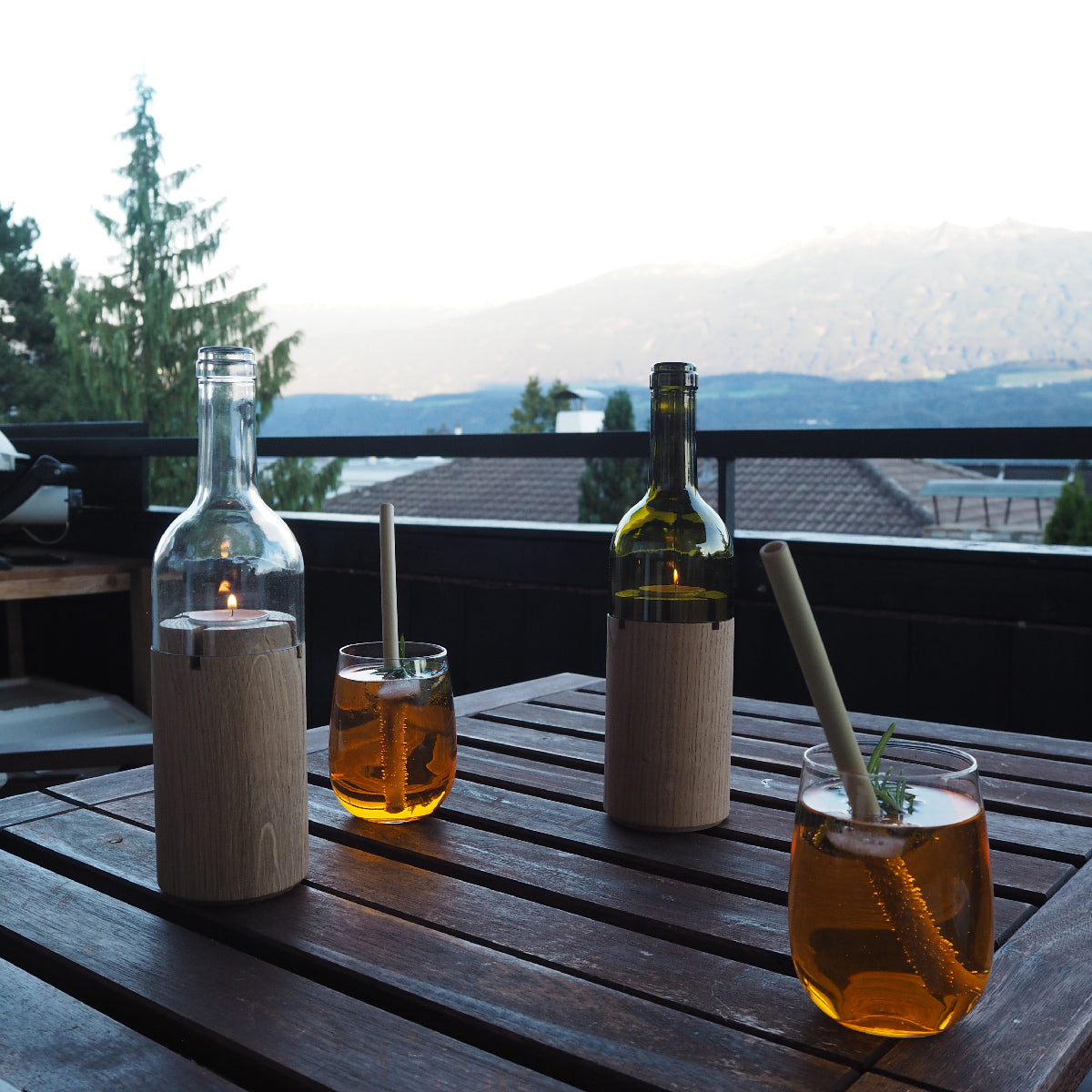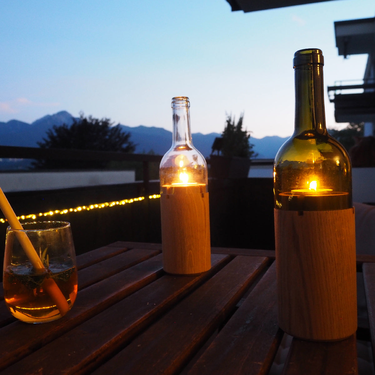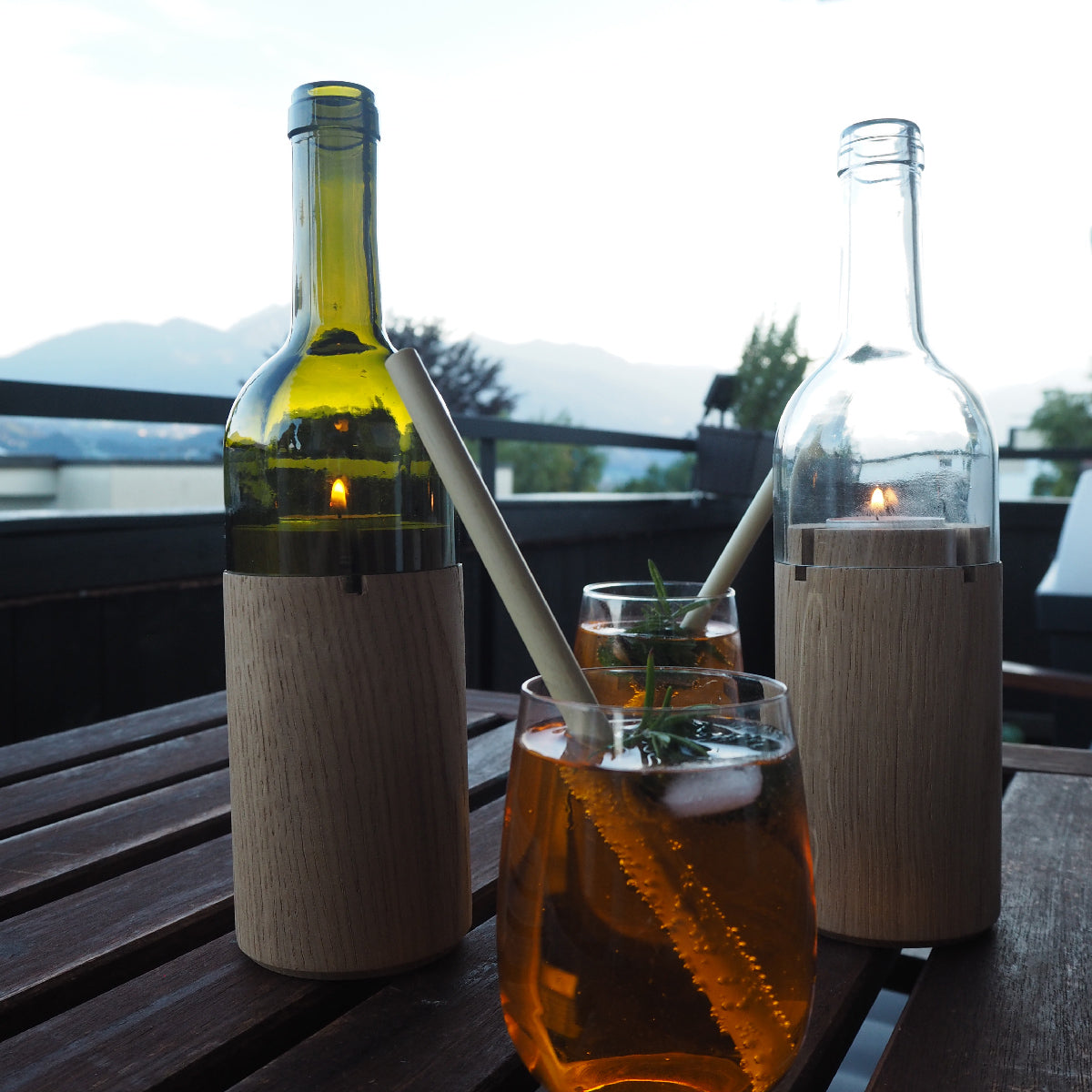 Das Glas von 'Windy' besteht aus dem Oberteil einer Weinflasche, der untere Teil aus geölter Eiche ahmt einer Weinflasche nach. Die Weinflasche ist in den Farben klar oder moosgrün erhältlich. Dieses besondere Windlicht wurde in einer geschützten Werkstatt in Handarbeit gefertigt.