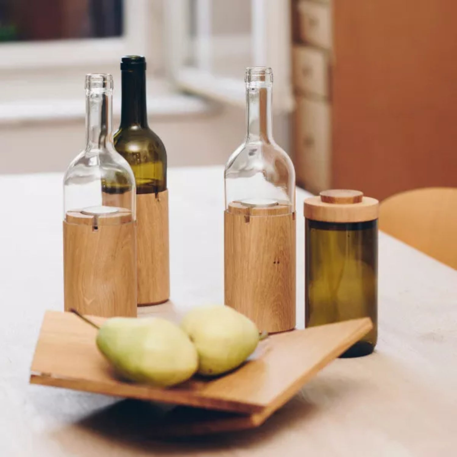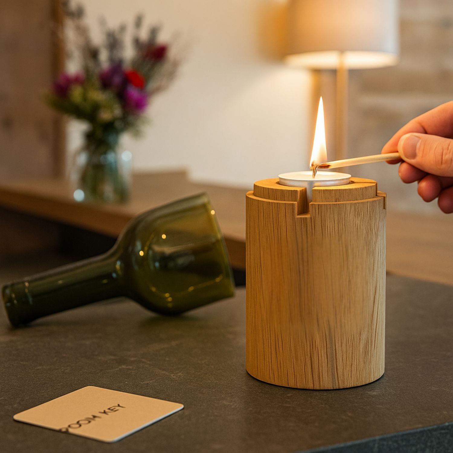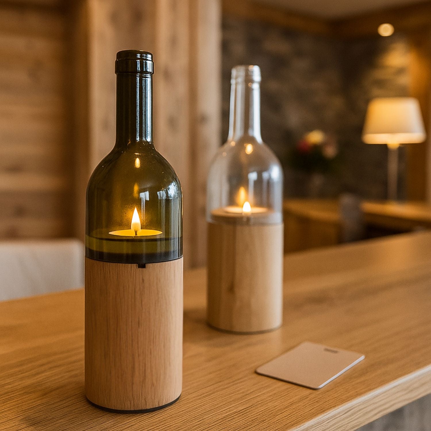 Das Glas von 'Windy' besteht aus dem Oberteil einer Weinflasche, der untere Teil aus geölter Eiche ahmt einer Weinflasche nach. Die Weinflasche ist in den Farben klar oder moosgrün erhältlich. Dieses besondere Windlicht wurde in einer geschützten Werkstatt in Handarbeit gefertigt.
